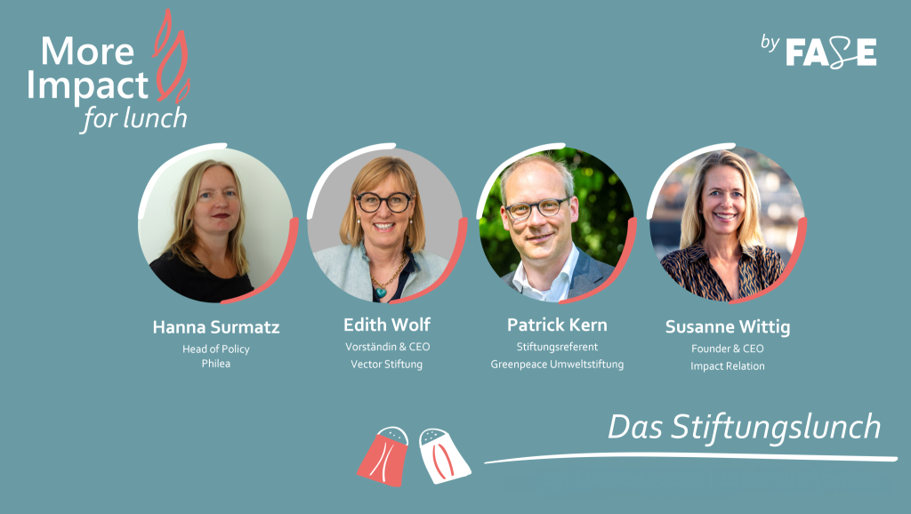 Wie lässt sich Stiftungsvermögen so einsetzen, dass es über klassische Fördermittel hinaus Wirkung entfaltet? Immer mehr Stiftungen entdecken Impact Investing als wirkungsvollen Ansatz, um ihr Vermögen im Einklang mit dem Satzungszweck ertragbringend einzusetzen – und damit aktiv zur Lösung gesellschaftlicher Herausforderungen beizutragen. In unserer More Impact for Lunch-Reihe “Das Stiftungslunch – Wege ins Impact Investing für Stiftungen“ am 29.10.2025 haben wir gemeinsam mit Hanna Surmatz (Philea), Edith Wolf (Vector Stiftung), Patrick Kern (Umweltstiftung Greenpeace) und Susanne Wittig (Impact Relation) frische Einblicke, Erfahrungen und Impulse serviert, wie Stiftungen ihr Kapital strategisch für mehr gesellschaftliche Wirkung einsetzen können.