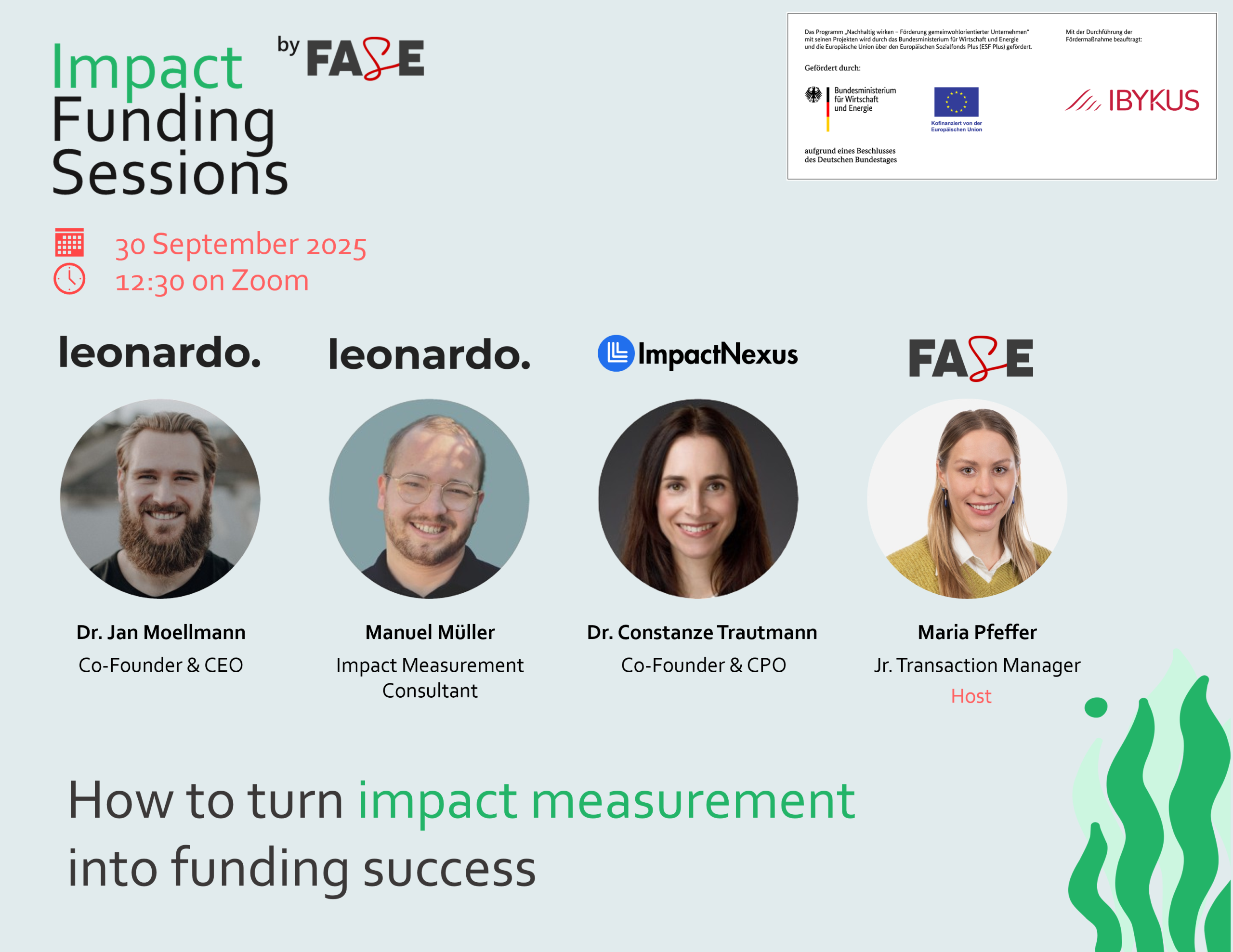 This Impact Funding Session explored how to build a practical and credible impact measurement and management system (IMM) that supports funding success. With insights from leonardo. impact and ImpactNexus, this session covered the first steps in impact measurement, relevant metrics to track, and how to communicate impact with clarity and confidence. Ideal for impact ventures from Seed-stage and beyond that want to strengthen their impact measurement and professionalize their impact management as they scale. Hosted by Maria Pfeffer, FASE.