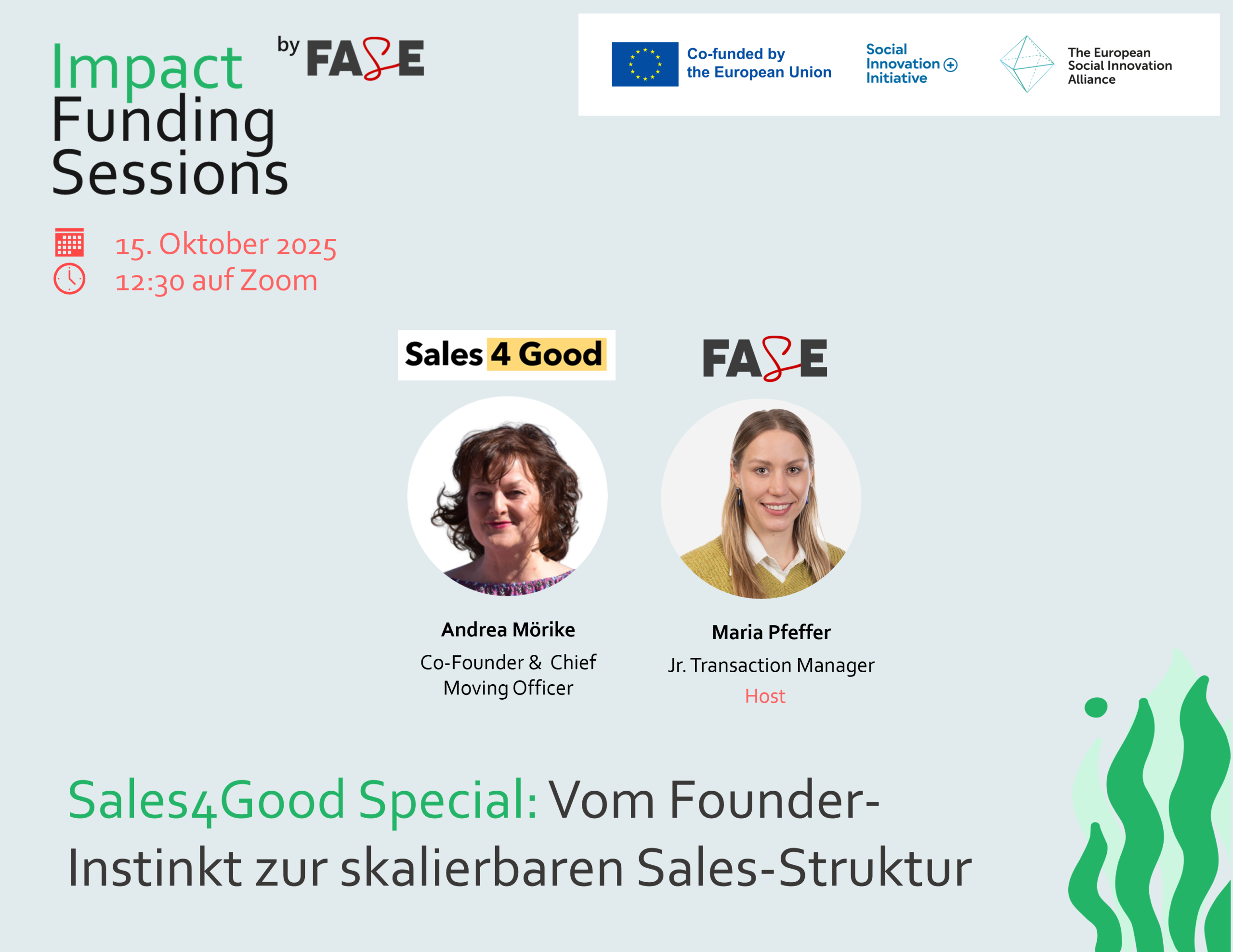 In der Frühphase treiben Impact-Gründer:innen den Vertrieb oft selbst – nah am Produkt, nah am Markt. Doch sobald Wachstum und Skalierung anstehen, reicht dieses Modell nicht mehr aus. Investor:innen achten auf belastbare Umsatzstrukturen, und Teams brauchen Systeme, die übertragbar und trainierbar sind. Ohne diese Systeme bleibt Vertrieb eine Blackbox – abhängig von Einzelpersonen und kaum skalierbar. In diesem Workshop mit Andrea Mörike von Sales4Good geht es darum, wie Impact-Gründer:innen Sales professionalisieren: nicht über reinen Provisionsdruck, sondern mit Prozessen, die Vertrauen, Motivation und Wirkung stärken. Gehosted wird die Session von Maria Pfeffer, FASE.