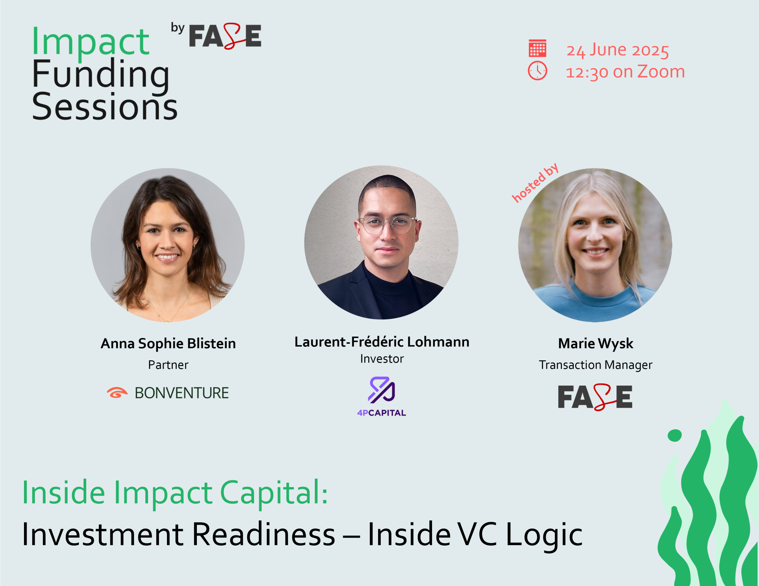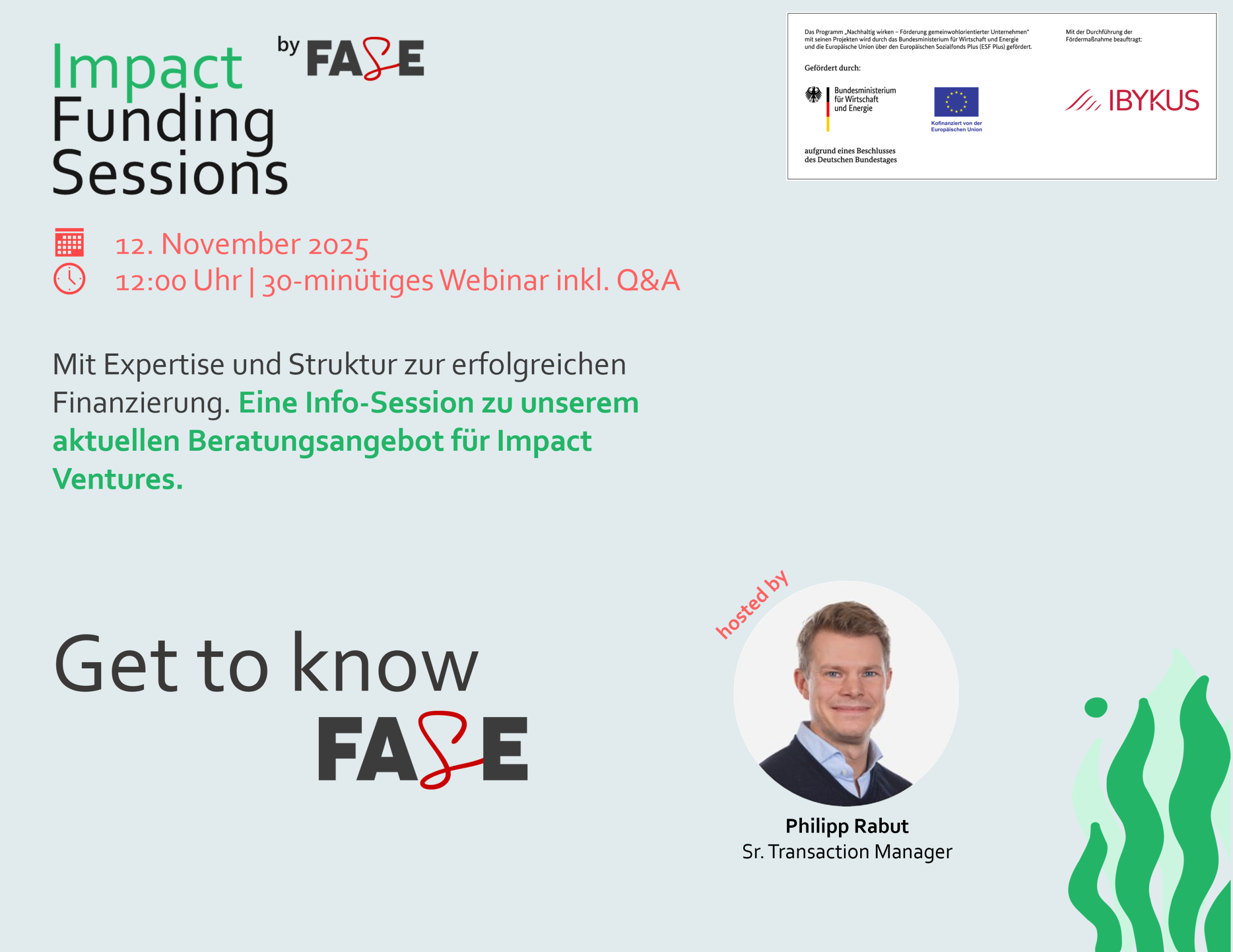 In diesem kompakten 30-minütigen Webinar erhältst du einen Einblick, wie FASE Impact Ventures strukturiert und strategisch durch den gesamten Finanzierungsprozess begleitet – von der Kapitalstrategie über Investor:innenmatching bis zum erfolgreichen Abschluss. Teilnehmende erfahren, wie professionelle Fundraising-Beratung Wachstum erleichtert, Einblicke in erfolgreiche Finanzierungsrunden liefert und welche vergünstigten Konditionen im Rahmen der BMWE-Förderung „Nachhaltig wirken“ aktuell möglich sind.